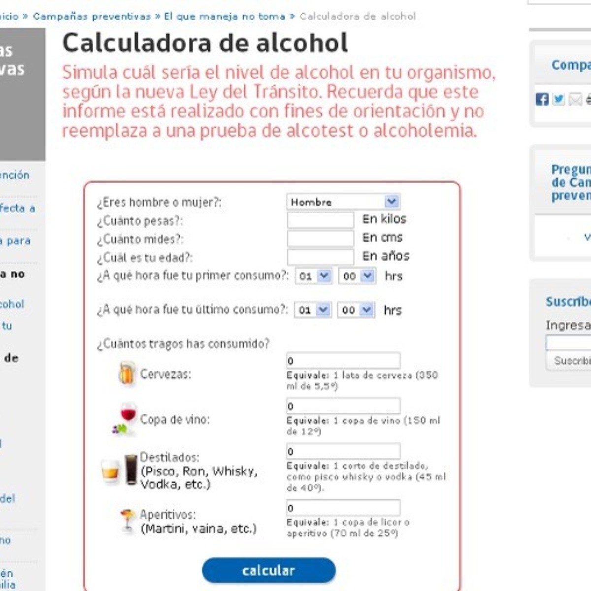 Con el objetivo de informar a la ciudadanía sobre los riesgos que implica conducir bajo los efectos del alcohol y los límites que establece la recién aprobada Ley del Tránsito el Servicio Nacional para la Prevención y Rehabilitación del Consumo de Drogas y Alcohol SENDA implementó una calculadora que mide el nivel de esta sustancia en la sangre. Esta calculadora en línea calcula la cantidad de nivel de alcohol que se consume en mL basadas en la concentración de alcohol en la sangre BAC en mg dL o mmol L para una sola ingestión de alcohol de una sola vez y el tiempo ya que el alcohol se consume. Calculadora implementada por Senda Tarapacá simula nivel de alcohol en la sangre 06022012 La aplicación que se encuentra disponible en el portal wwwsendagobcl permite que las personas simulen las condiciones físicas en las que se encontrarían de acuerdo a su ingesta de alcohol.