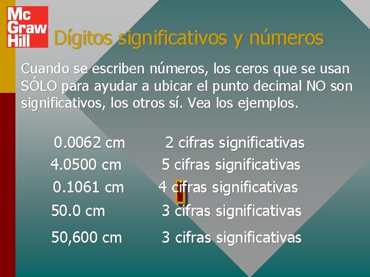 Los ceros a la izquierda del primer dígito que no es cero sirven solamente para fijar la posición del punto decimal y no son significativos. 1-Cualquier digito diferente de cero es significativoAsí 845 cm tiene tres cifras significativas 1234 kg tiene cuatro cifras significativas y así sucesivamente. 0010 tiene 2 cifras significativas.