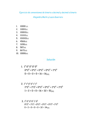 Ejercicio De Conversiones De Binario A Decimal Y Decimal A Binario